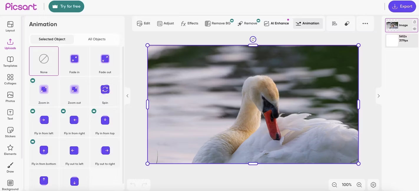 Phiên bản miễn phí của Adobe Express tiếp theo trong danh sách thân thiện và dễ sử dụng. Truy cập trang hoạt ảnh Adobe Express và nhấp vào Add your animation now. Khi ở trong không gian làm việc, hãy nhấp vào Upload photo để thêm ảnh của bạn. Bạn có thể tìm thấy tùy chọn Animation ở phía bên phải.