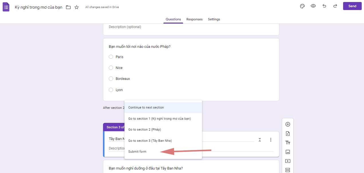 7. Ở phía dưới của mỗi Section, chọn menu thả xuống và chọn Submit form. Điều này đảm bảo sau khi chọn câu trả lời, người dùng không bị đưa tới phần họ đã không không chọn. Bạn không cần làm việc này cho phần cuối cùng của Google Forms.