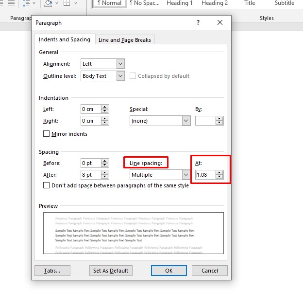 Tỷ lệ giãn cách dòng mặc định trong word hiện nay