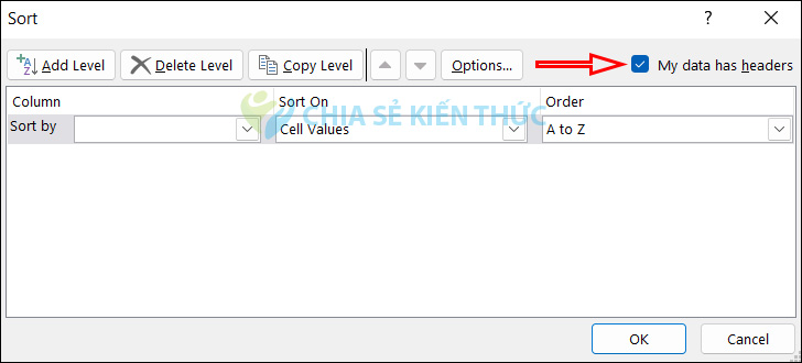 Lúc này hiển thị bảng Sort để người dùng tiến hành điều chỉnh. Trước hết nếu vùng dữ liệu bạn chọn bao gồm tiêu đề thì tích chọn vào My Data Has Headers.