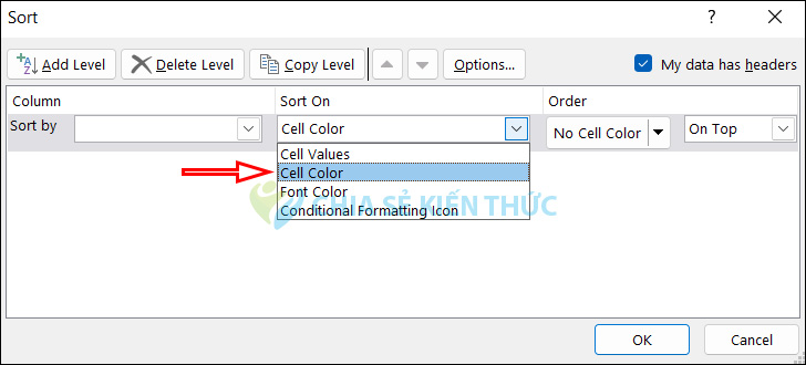 Tiếp đến tại Sort By bạn nhấn vào mũi tên rồi chọn cột dữ liệu cần lọc. Tại Sort On nếu chúng ta muốn sắp xếp dữ liệu bằng màu nền ô thì chọn Cell Color, nếu muốn sắp xếp theo màu chữ thì chọn Font Color.