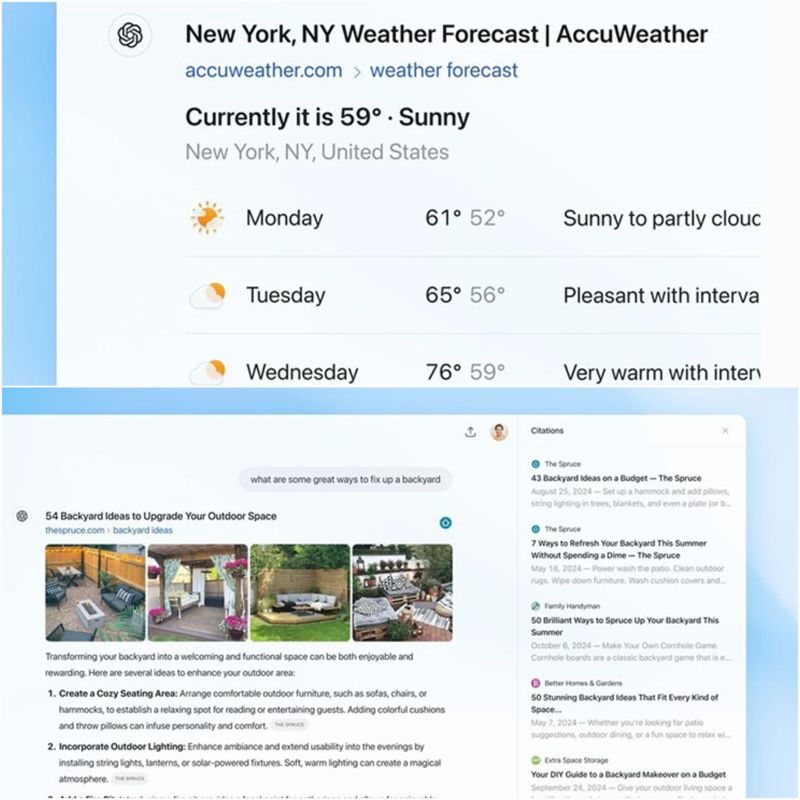 OpenAI cho biết họ đã kết hợp lợi ích của giao diện ngôn ngữ tự nhiên với các thông tin cập nhật như điểm số thể thao, tin tức, báo giá cổ phiếu và nhiều lĩnh vực khác vào ChatGPT Search. Công ty đã hợp tác với các nhà cung cấp tin tức và dữ liệu để bổ sung thông tin cập nhật và thiết kế trực quan mới cho các danh mục như thời tiết, chứng khoán, thể thao, tin tức và bản đồ.
